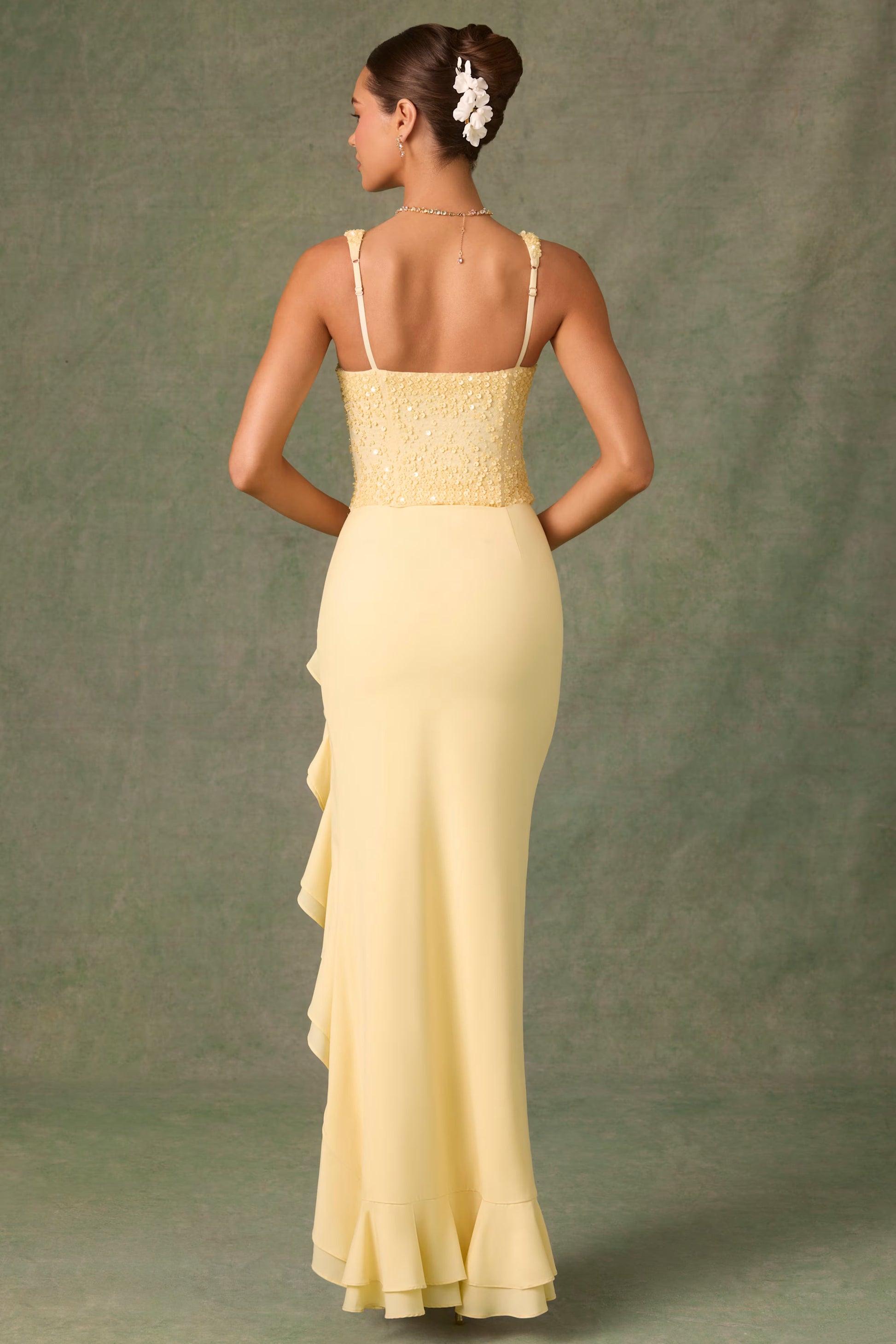 Embellished Ruffle-Trim Corset Gown in Yellow