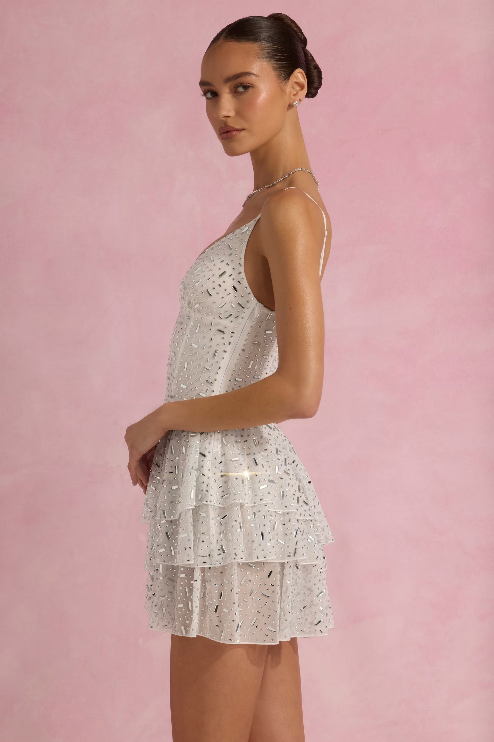 Embellished Ruffled Tiered Mini Dress in White