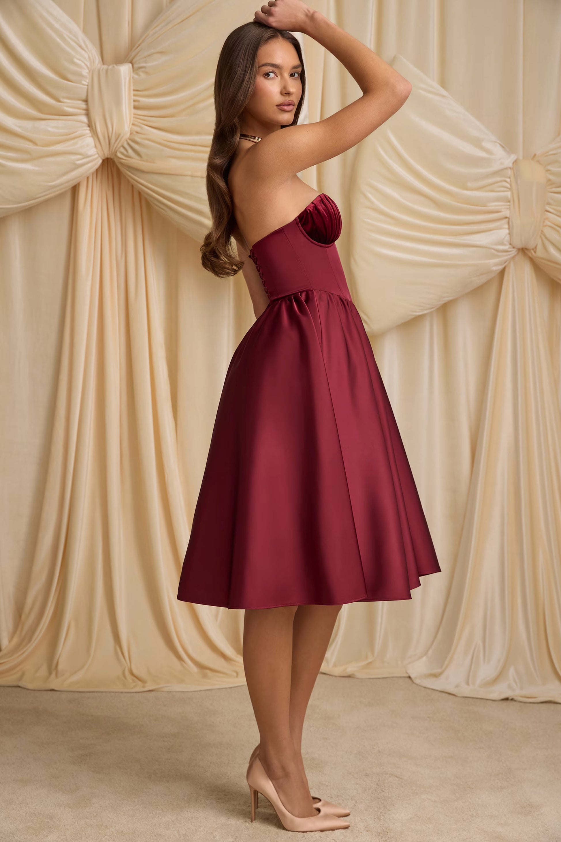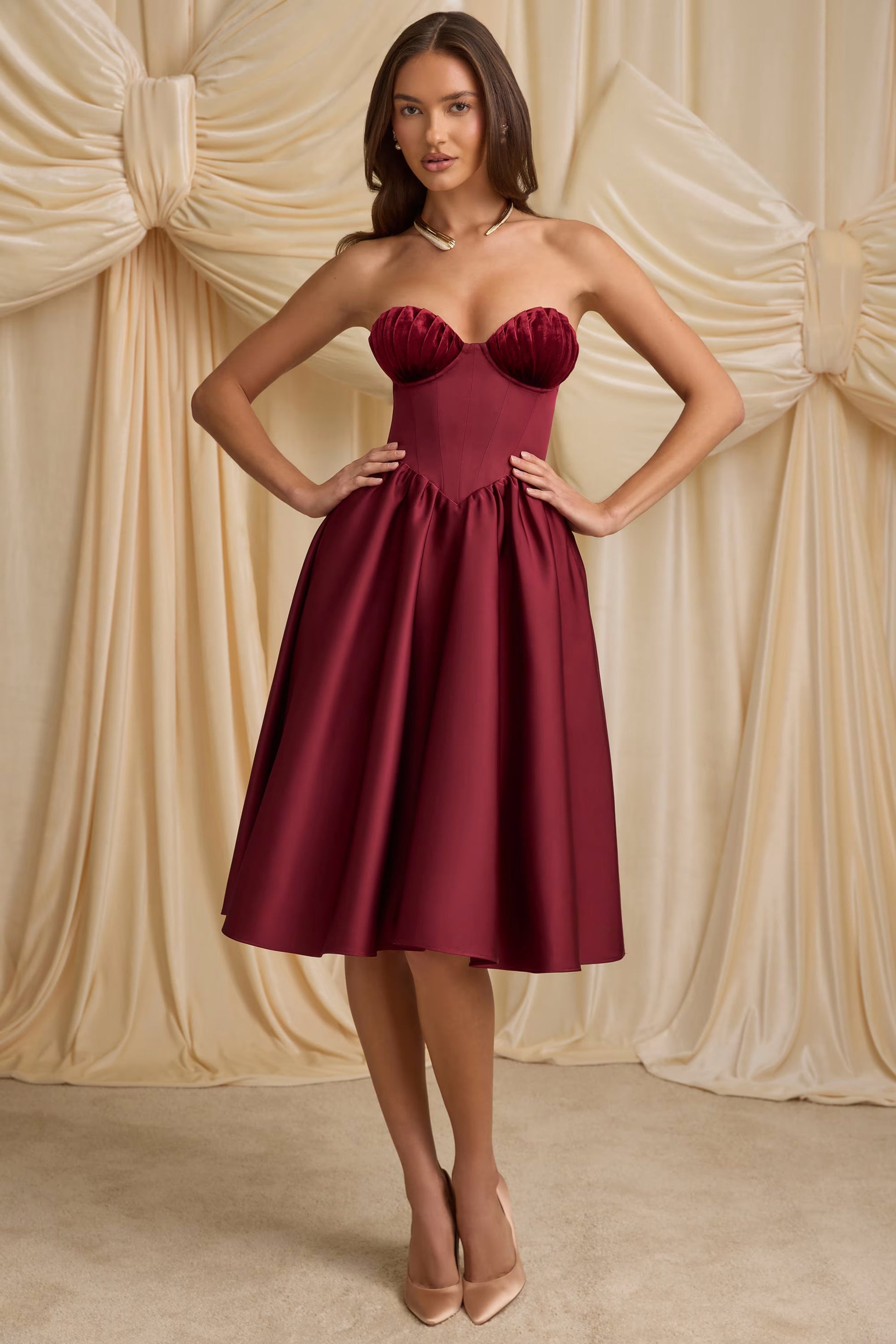 Channel classic glamour with our Gabrielle midi dress. Available in two enduring hues, it’s made from premium, non-stretch bonded satin with a built-in corset bodice for enhanced support and a gathered full skirt that creates a stunning silhouette. It’s elevated with pleated wired cups and a signature lace-up back that can be adjusted for your perfect fit.
